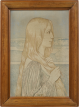 If this stylized, eminently graphic profile refers to other works by the artist, including several sanguines and some important oil paintings, in particular La Pensée (private collection), the option chosen here by Séon reveals several of his obsessions. Derealization, flatness and decorative monumentality define the vision of a painter intent on achieving the ideal. The use of pencils in a very limited range of colors (brown and blue), an extremely subtle hatching system and the fact that the canvas is left in reserve in places, attest to a desire for extreme simplification. By abandoning the pictorial palette, as well as the monochrome of charcoal or red chalk, in favor of a bi-chromatic cameo, Séon seeks, in his usual paradoxical way, to distance himself from the effects of academic and impressionist painting, while at the same time seeking a process that strikes the viewer.
