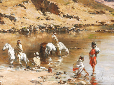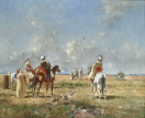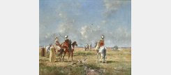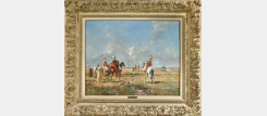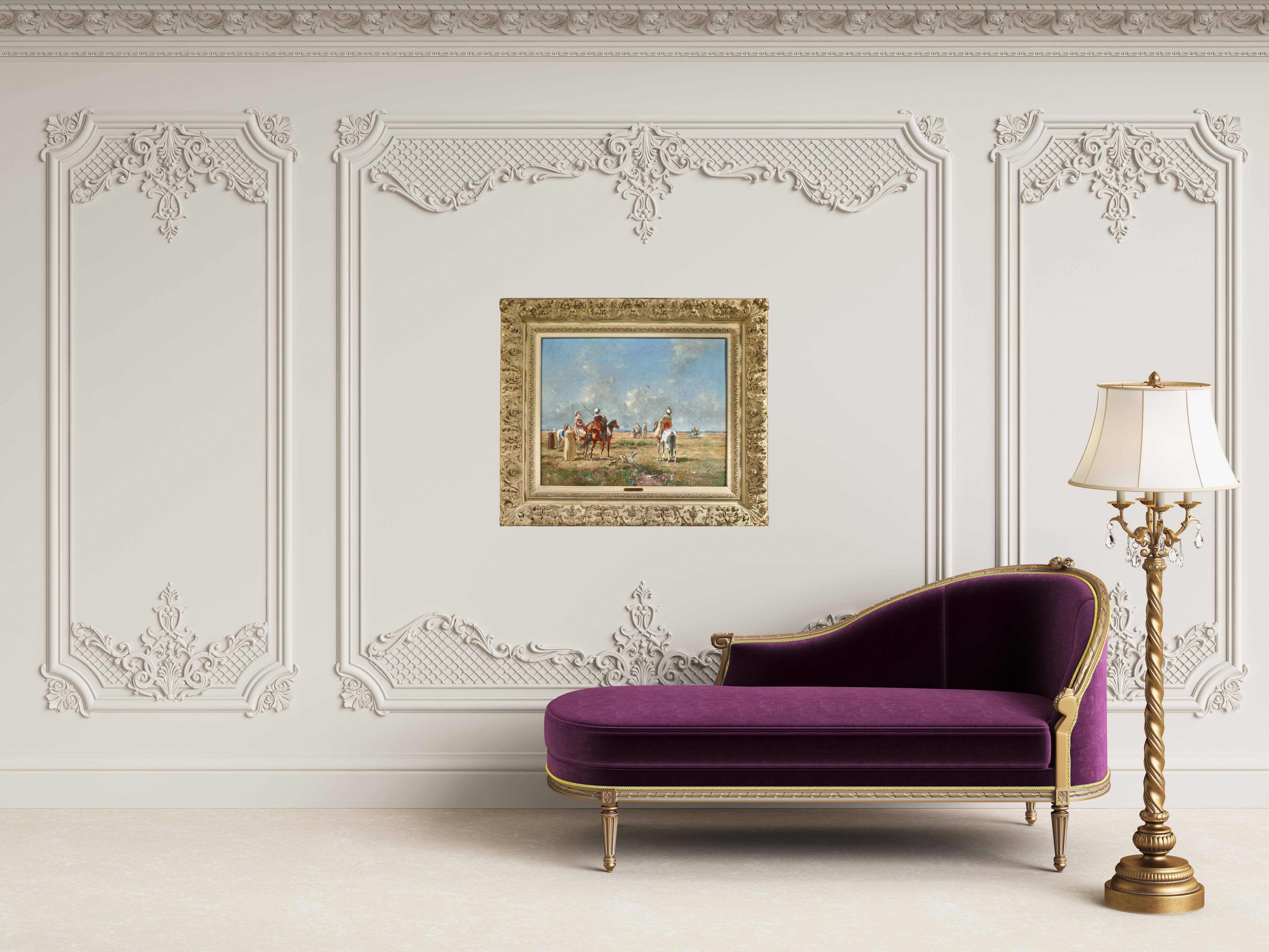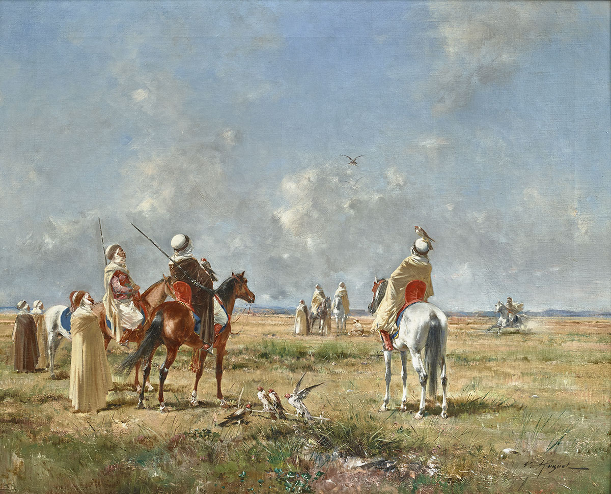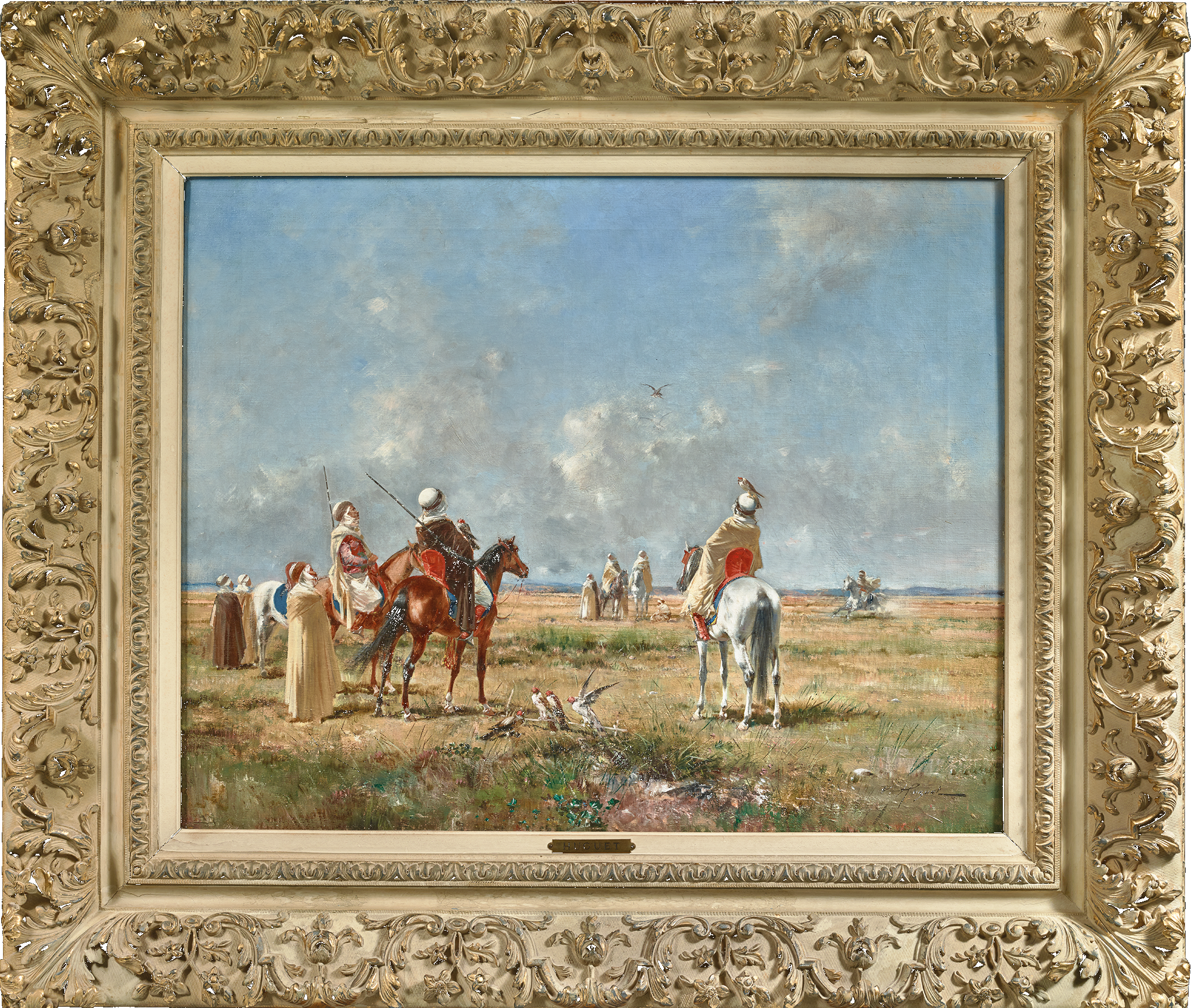 Although falconry, also known as the ‘sport of princes’, is now listed as intangible cultural heritage by UNESCO, it is above all a traditional art that has fascinated many Western artists during their stays in the East. Like his master Eugène Fromentin, Victor Huguet also depicted this subject, which allowed him to express his talent in the representation of local customs and horses as well as in the art of landscape painting. The work we present here seeks to show these three aspects in a masterful and authentic Orientalist painting. The sky, in which the falcon reigns supreme, takes on paramount importance in our painting, occupying two-thirds of the composition. The horses' coats, rendered with great attention to texture and shine, catch the light. Their heads are raised and all eyes are turned towards the falcon in flight. In the foreground, four birds of prey wait patiently to take flight on a small wooden perch. An important subject in the artist's oeuvre, Falconry is mentioned in 1875 at the exhibition of the Société des amis des arts in Marseille, as well as at the 1931 colonial exhibition in Paris, nearly 30 years after the painter's death. Our painting, which can be dated to around 1880, reveals the combined influence of Eugène Fromentin and a freer, almost impressionistic touch. The harmonies of ochres, reds and blues so characteristic of Huguet are evident in this painting, which is representative of his talent.