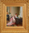 The light coming from the window with its heavy curtains drawn envelops the scene in a diffuse clarity that unifies the whole and accentuates its hushed character. Through this harmonious orchestration of colours and textures, Gustave de Jonghe goes beyond mere anecdote to convey the vagaries of inner life.