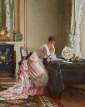 On the right, a bouquet of pearly-toned roses, probably associated with the contents of the letter, responds chromatically to the delicate shades of the dress. With a supple and precise brush, the artist excels in rendering materials: the shimmer of satin, the transparency of lace, the velvety depth of the carpet, the polished shine of bronze.