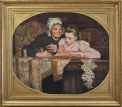 Following the classical tradition, Eugène Buland plays on multiple contrasts to capture our attention: youth and maturity, pink dress and mourning dress, manual labor and intellectual work. The succession of horizontal and vertical planes lends an important dynamic to this representation, which also has a certain immobility that we find in his portraits from this period, often bringing them closer to photography.