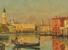 In the background, we can make out a few glassware objects, arranged on the edge of the fireplace, including a footed vase also present in the 1898 painting “Une bonne trouvaille” (A Good Find), now in the Musée Unterlinden in Colmar.