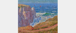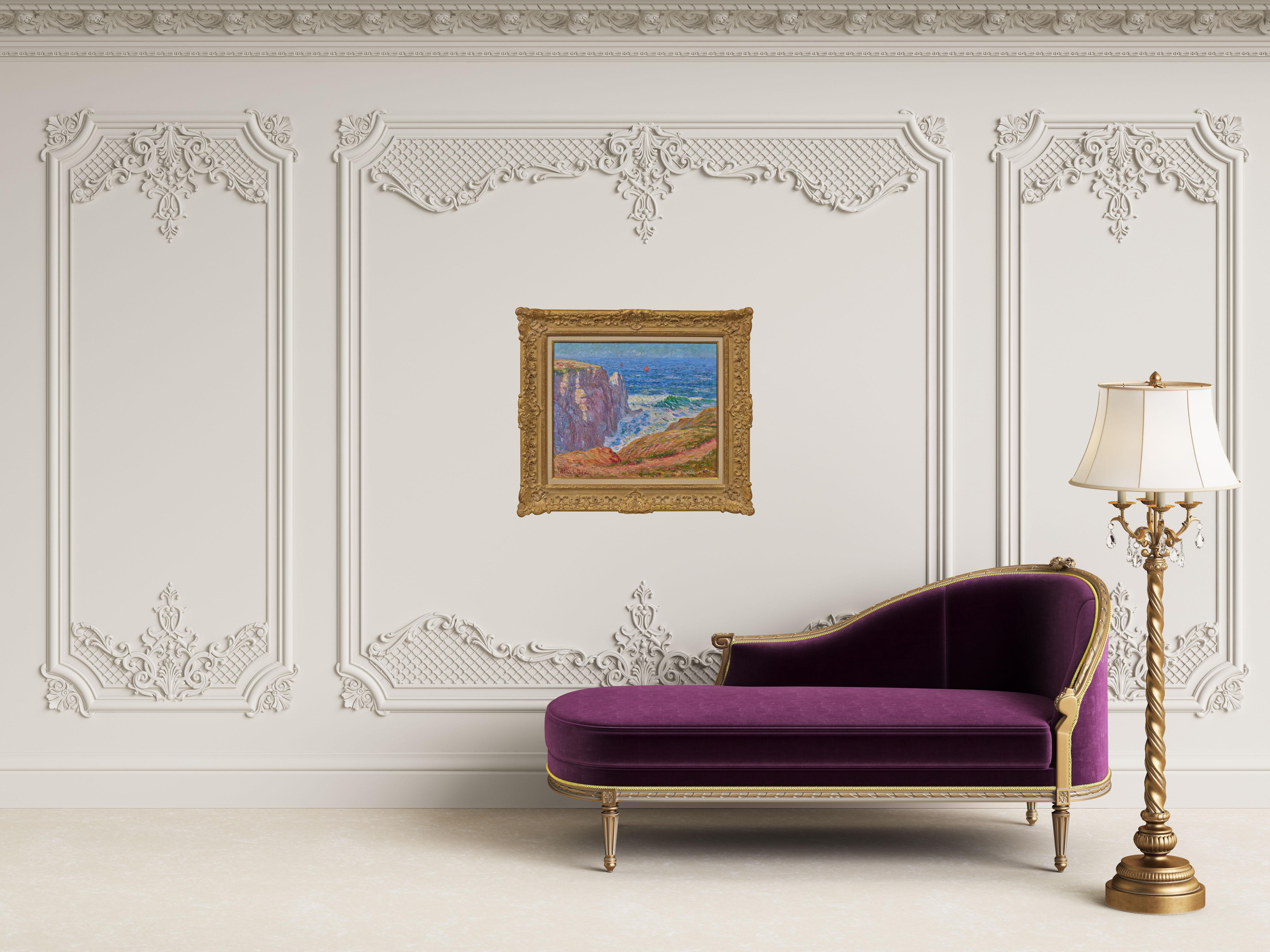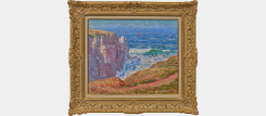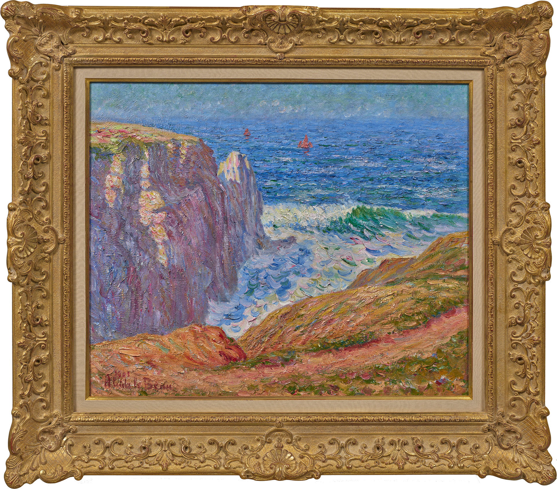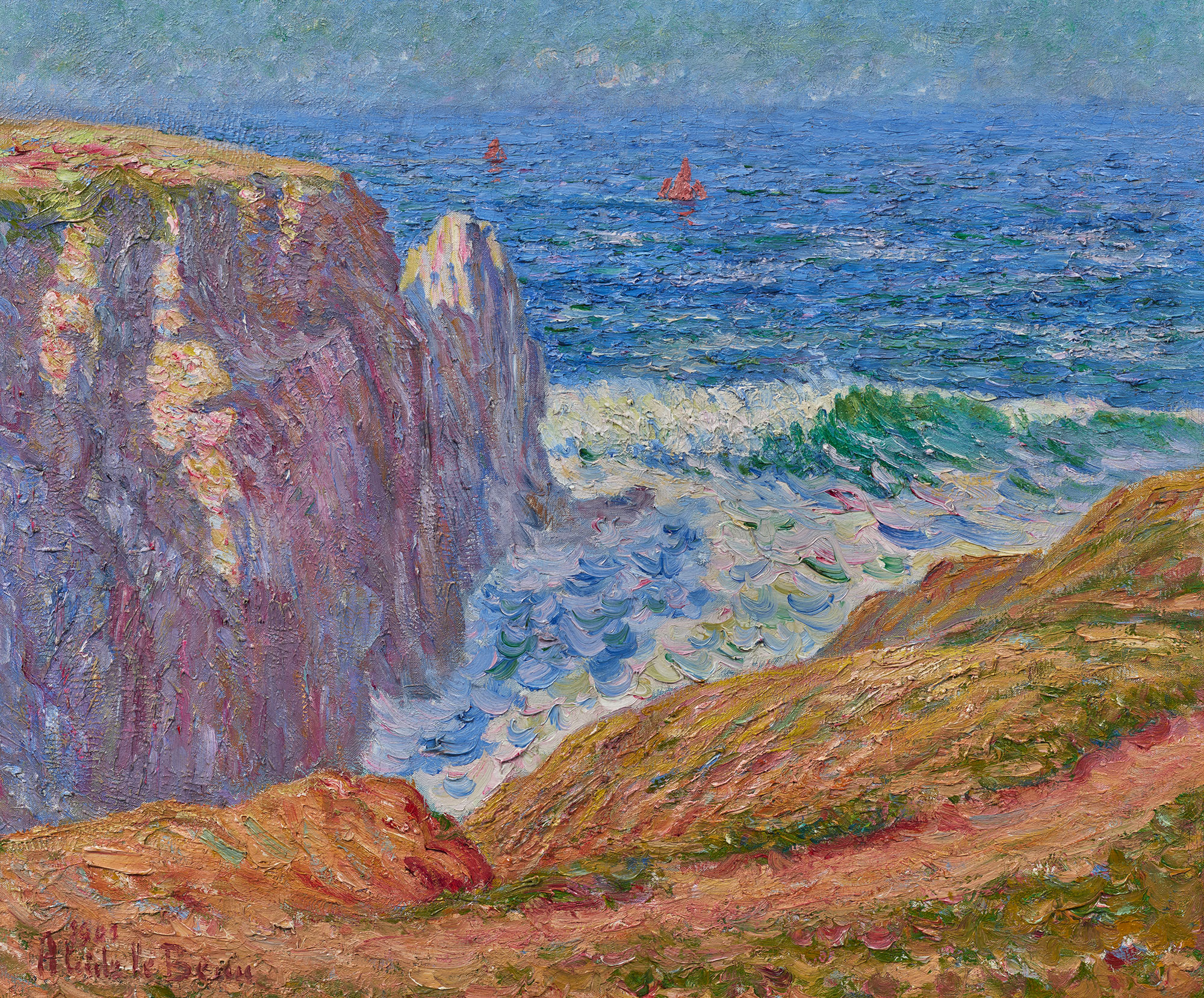As in many of Henry Moret's and Gustave Loiseau's coastal landscapes, Alcide Le Beau favours a high vantage point, allowing the viewer's gaze to plunge down towards a rocky cove. A steep cliff on the left contrasts with the gentler slopes in the foreground, while a foaming wave breaks at the foot of the rocks.
