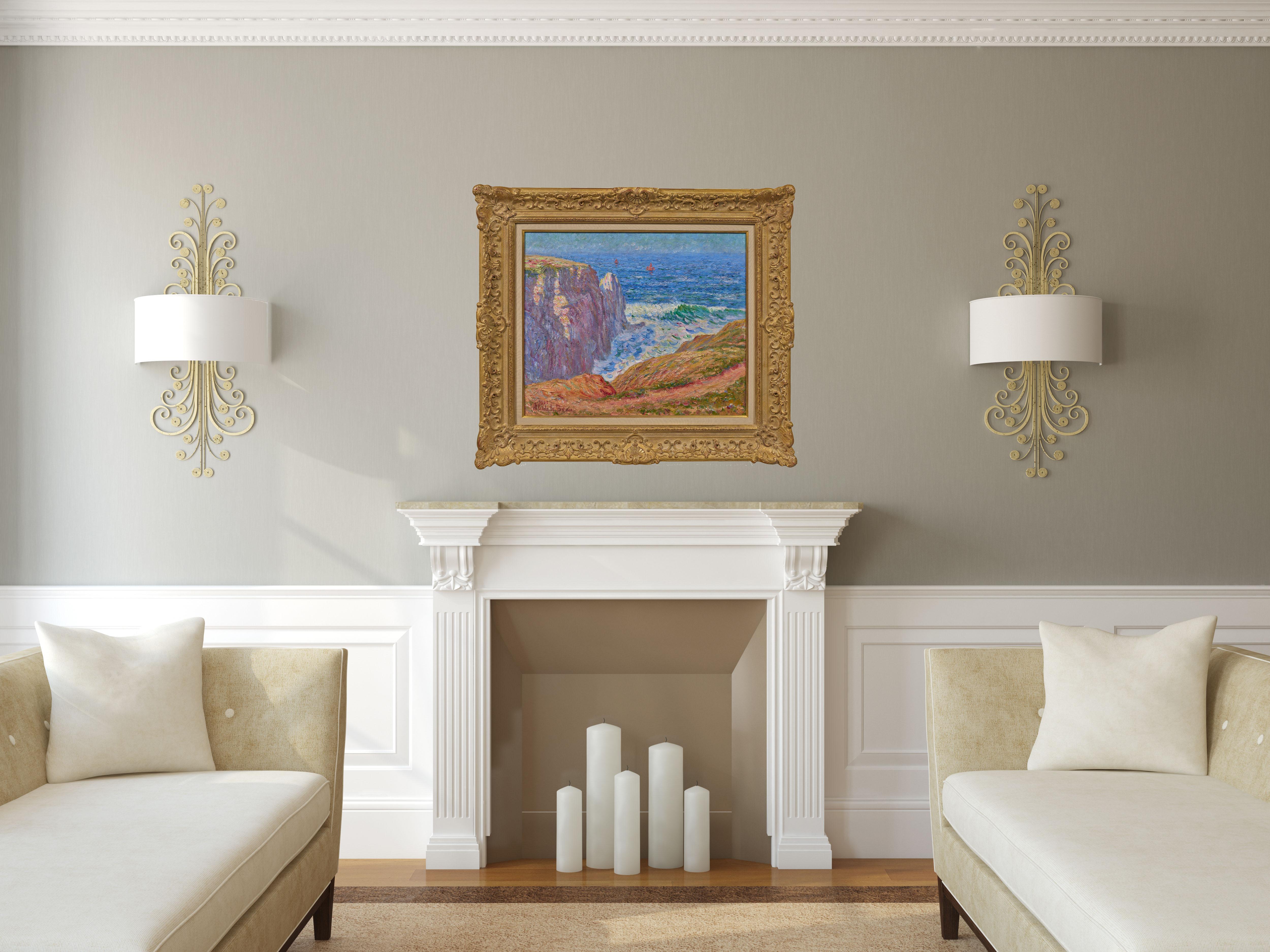 The brushwork is energetic and luminous, applied in small, thick strokes that make the blues of the sea and sky vibrate and enliven the ochres, mauves and greens of the moors. Offshore, a few red sails dot the horizon, accentuating the impression of depth and the maritime atmosphere. The whole composition creates a scene that is both energetic and contemplative, in which the painter focuses on the movement of the water and the effects of light on the coast.