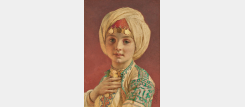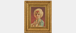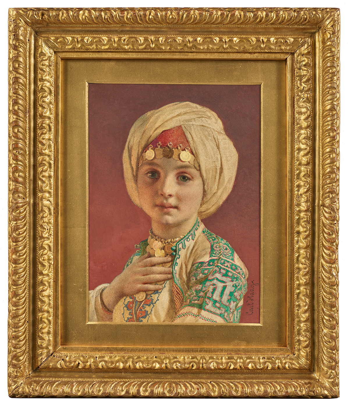 During his first trip to the East, which he began in 1858 and did not complete until 1860, Carl Haag devoted himself to the careful observation and study of landscapes and costumes. Our delicate portrait of a young princess, with its detailed and finely rendered fabrics, bears witness to this meticulous observation of costume. The painter chose to depict his model in three-quarter profile, her gentle, clear gaze fixed on the viewer while her right hand rests delicately on the rich adornment around her neck. The gold pendants falling on her forehead catch the light and enchant the eye. The harmonious combination of greens, reds and browns visible in our watercolour testifies to Haag's skill as a colourist, who developed new techniques to obtain the desired colours by superimposing different layers of wash and then scraping off the excess. The subtly treated background, with its gradation to focus the light on the young princess's face, and the light in this watercolour illustrate the artist's great mastery of this technique. This admirable technical mastery was recognised by all, as he was elected a member of the Royal Watercolour Society in 1853.