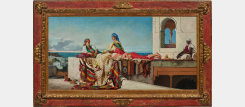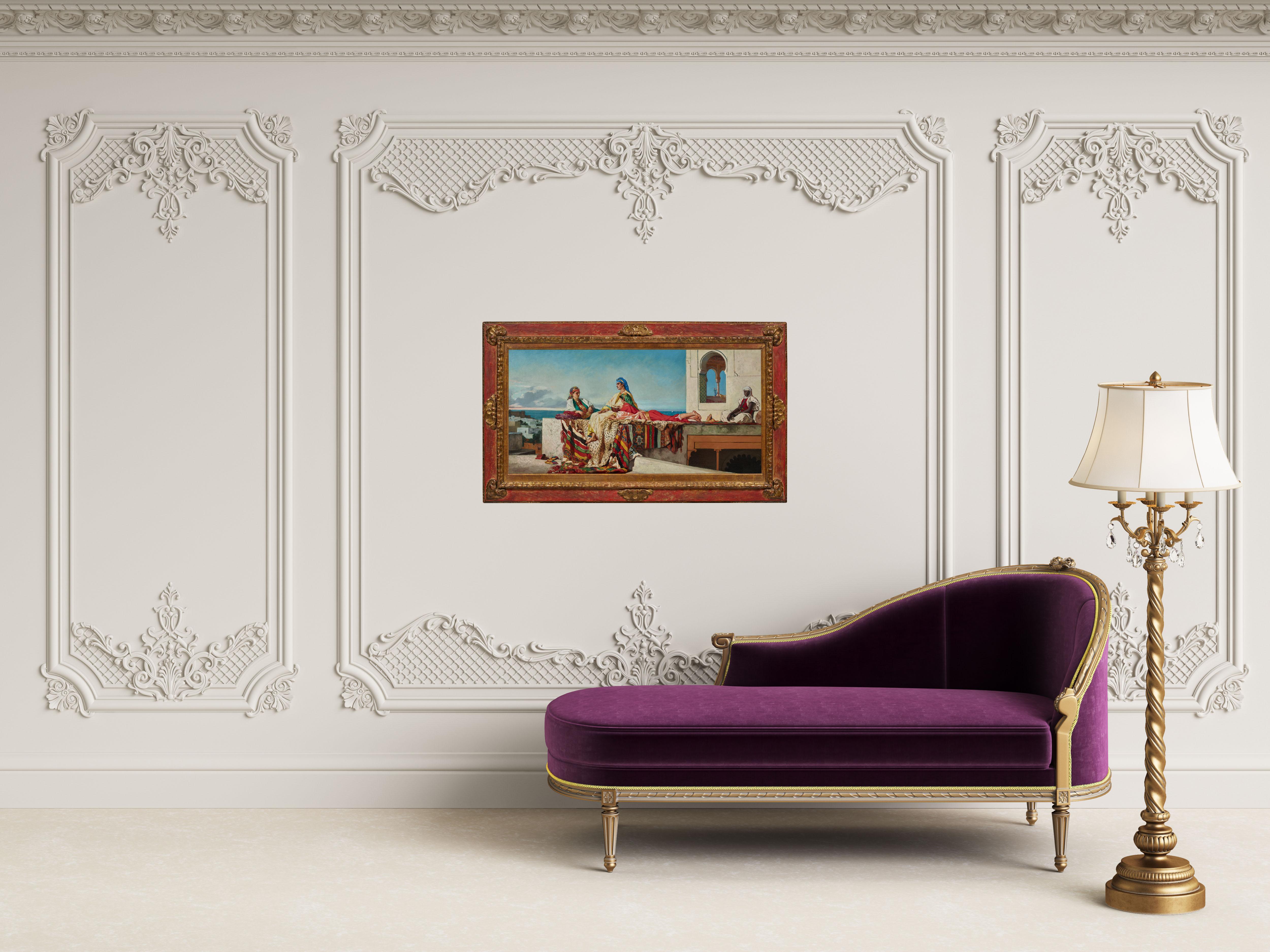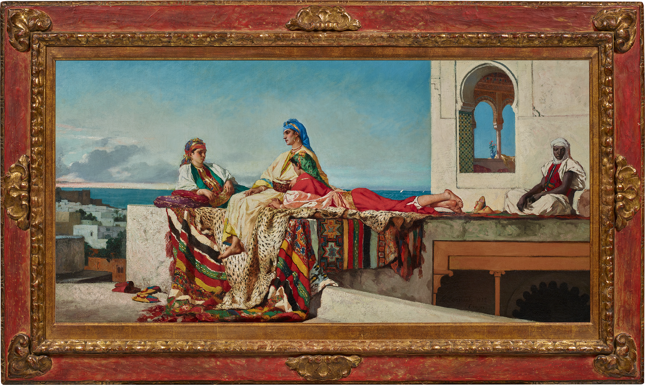 Our painting was done during this stay, in 1872. It depicts three women relaxing on the terrace of a Tangier palace. The same reverie envelops them, and although they are together, each seems lost in her own thoughts. Their backs are to the ocean and the city that stretches out below the palace. To the right, leaning against a whitewashed wall, a Moorish musician has left her tambourine beside her. The moment is calm and silent.