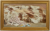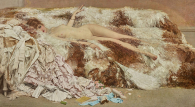 Après le bal est un exemple frappant du travail de Van Beers pendant les années parisiennes. En 1886, l'oeuvreest exposée à Londres, au Salon Parisien de New Bond Street, sous le titre "La beauté qui s'éveille". Elle fait également partie de l'exposition personnelle de Van Beers à la Galerie Durand-Ruel en 1888, sous son titre actuel "Après le bal " . Le sujet très suggestif du tableau était choquant aux yeux de nombreux critiques contemporains. Le tableau montre une belle jeune femme allongée sur un canapé en fourrure, sa somptueuse robe de bal négligemment jetée, ses chaussures et ses bas de soie bleu clair sur le sol devant elle, à côté d'un livre à la couverture jaune et de ce qui semble être un porte-cigarettes vert. La nudité de la femme est soulignée par son collier de chien en perles et les bracelets qu'elle porte aux bras. Un magnifique éventail à plumes est attaché par une ficelle à l'un de ses bracelets, comme si elle avait encore besoin de se rafraîchir avec. La femme croise sans vergogne notre regard d'un seul œil et semble même tendre un pied élégant dans notre direction. Il n'y a guère de doute sur son identité : c'est une belle et séduisante coquette, l qui revient d'un bal, où elle a dû attirer autant d'attention que dans le tableau. Après le bal est cependant plus qu'une représentation émoustillante d'une demi-mondaine parisienne. C'est aussi une expérience esthétique, presque whistérienne, sur les couleurs. La gamme de couleurs restreinte du tableau est extrêmement limitée : à l'exception des taches sombres sur le canapé, les couleurs vont d'un jaune très pâle à un rose doux, ponctué uniquement par le vert du sac à main, le jaune vif de la couverture du livre, le bleu clair des bas et le rouge de la bouche de la femme. Van Beers était très attentif à l'effet sensoriel que le tableau devait créer. Au Salon parisien de Londres, où le tableau était l'un des points d'attraction, il a été accroché dans une alcôve sombre spécialement conçue, encadré par des tentures vert foncé et éclairé par le haut à l'aide d'une lampe électrique derrière une feuille de papier rose tendue.