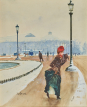 La neige, déposée en fines touches claires sur le sol et les réverbères, unifie la scène dans une atmosphère froide et légèrement brumeuse. Par un usage subtil de la gouache rehaussant l’aquarelle, Béraud parvient à traduire les reflets humides de la chaussée et la légèreté poudrée d’un plein-air hivernal.