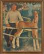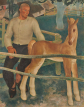 Le poulain est ici symbole de jeunesse et de vitalité tandis que la figure de l’homme adulte semble fatiguée, vraisemblablement à cause du travail aux champs. La douceur des tons suggère une fin de journée ainsi qu’un moment de tranquillité et de repos après une journée de labeur. En représentant un moment suspendu dans le temps, Anto-Carte célèbre ici la beauté de la vie rurale ainsi que la relation primordiale entre l’homme et la nature.