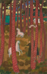 L’île Chevalier se situe dans l’estuaire de la rivière de Pont-l’Abbé, près de Loctudy où l’artiste séjourne avec son épouse Marthe au cours de l’été 1894. On trouve dans ce tableau, qui représente le bois de pins de l’île, des motifs récurrents de l’oeuvre du peintre à cette époque : chevaux, baigneuses, arbres aux troncs élancés, traités de manière décorative. L’inscription « Ile Chevalier » sur un phylactère donne à la scène un caractère médiéval. Cette oeuvre peut être rapprochée d’un projet de vitrail élaboré la même année dans le cadre d’une commande du marchand Siegfried Bing (Le Cheval blanc, gouache sur papier collé sur toile, 130 x 76 cm, coll. part.).