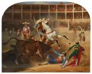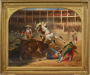 Réalisé en 1856, notre tableau met en scène toute la dramaturgie de la corrida, dont la tragédie n’échappe pas aux pinceaux d’Henri Frédéric Schopin.