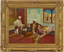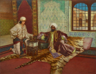 Voici une scène où l’on surprend dans son riche intérieur un sultan à l’heure du thé. Confortablement installé sur une large peau de tigre et des coussins soyeux posés sur un tapis, il attend que le thé soit servi, tenant à la main sa longue pipe ottomane. Il porte sur sa tunique de soie verte un épais manteau d’intérieur en velours pourpre richement brodé et dont les manches repliées laissent entrevoir une doublure de soie mauve. Son turban blanc se détache des carreaux de faïence qui décorent les murs.
