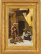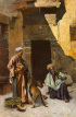 Au détour d’une ruelle ombragée du Caire, le peintre saisit la rencontre inattendue d’un fauve et d’un dresseur de singe. Le petit animal se réfugie, terrifié, sur l’épaule de son maître, poussant un cri de détresse sous le regard amusé du dresseur. Celui-ci, confiant malgré la présence du fauve, reste tranquillement assis au sol, sans la moindre appréhension, tandis que debout, le regard tourné vers son léopard, un homme retient fermement son fauve. Ce dernier montre déjà les crocs en grognant le petit primate.