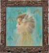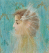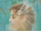 Dans cette œuvre de jeunesse - encore signée Lucien Lévy - il choisit, en référence aux maîtres italiens qu’il admire, de représenter cette jeune femme dans un profil de médaille parfait. Il y apporte une modernité subtile en attirant notre attention sur l’œil de la jeune femme et sur la fleur cristalline dont partent, tels des rayons de lune, les plis de son voile blanc qui dissimule une partie de son visage, de ses cheveux et son buste. L’accord entre le modèle et son environnement ponctué d’éléments floraux est annonciateur de son travail futur, qui mêlera dans des mouvements souvent intenses et ondoyants la femme et la nature qui l’entoure.