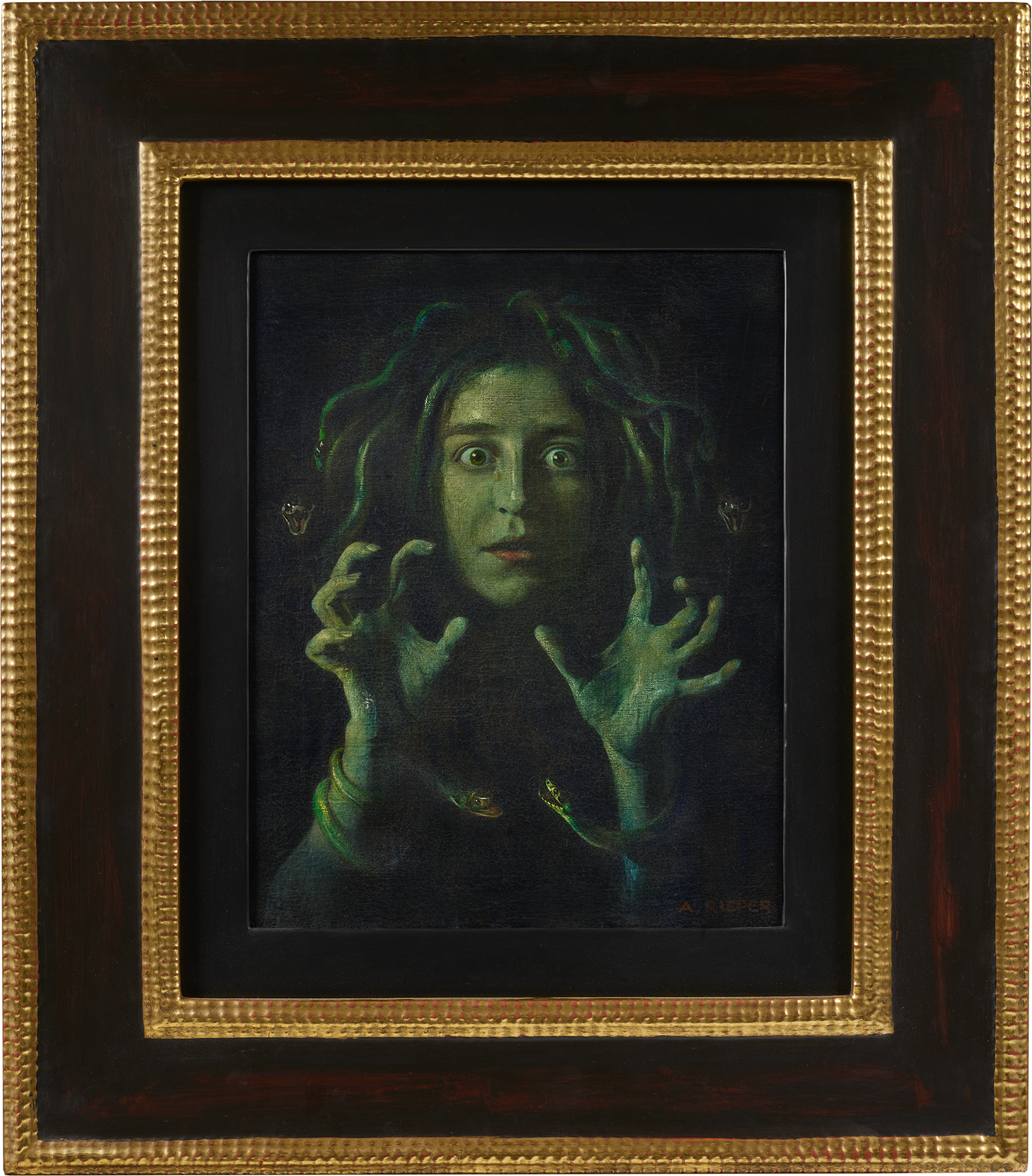L’œuvre de Rieper est représentative de cette figure de Méduse comme femme fatale qui tend à perdre son aspect monstrueux pour devenir un symbole à la beauté énigmatique. Il la représente avec les caractéristiques classiques du personnage antique : chevelure serpentine, yeux écarquillés, facialité torturée.