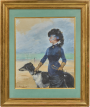 Daté 1880, voici l’un des tous premiers portraits de plein air que réalise Louise Abbéma. On y voit l’élégante actrice se promener au bord de la plage, avec son chien, un grand lévrier écossais qu’elle retient par le collier. Louise Abbéma dans une palette très juste se joue des bleus de la mer, du ciel et de la robe de son modèle. Chien et femme regardent dans la même direction et nous offrent un profil parfait qui se détache sur le fond marin.