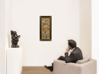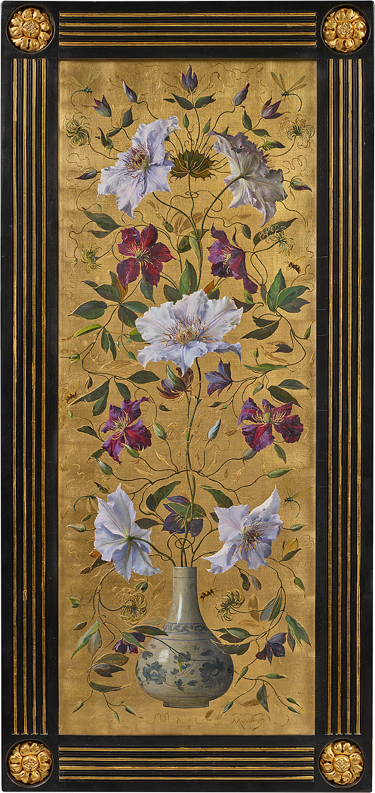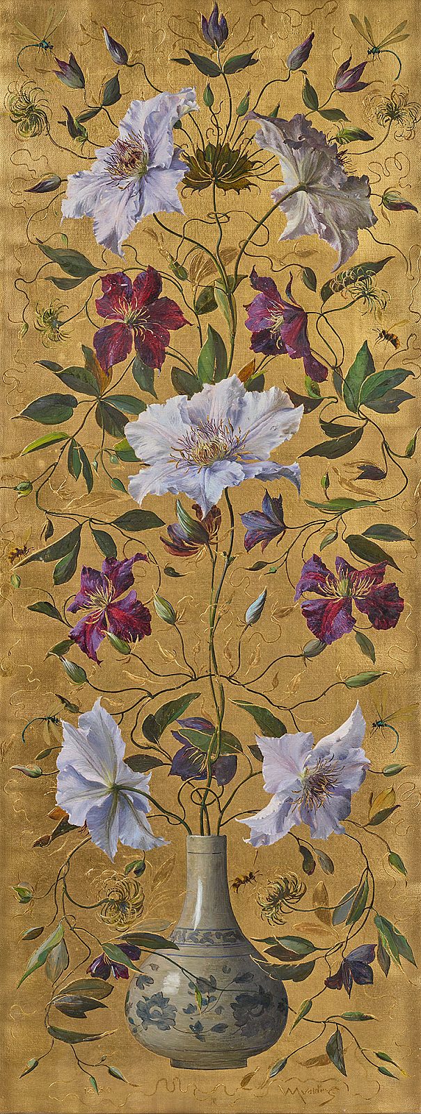 Au centre d’un vase balustre à col étroit aux décors bleutés, directement inspiré des céramiques orientales, s’élance une tige de clématite dont les vrilles dessinent un réseau souple et savamment équilibré. Les fleurs, déployées à différents stades d’épanouissement, alternent les tonalités ivoire et pourpre profond. Les corolles pâles, modelées par de délicats glacis, semblent capter une lumière diffuse qui se détache avec éclat sur l’or mat du fond. Les fleurs plus sombres, d’un rouge violacé intense, introduisent un contrepoint chromatique vibrant, conférant à l’ensemble une richesse presque textile.