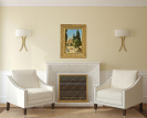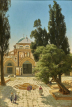 Dans une atmosphère très lumineuse, propre au traitement sûr et original de Carl Cowen Schirm, la façade nord de la mosquée Al-Aqsa se dévoile entre les arbres, au bout de l’allée pavée où se trouve la fontaine des ablutions, Al-Kas, animée par quelques personnages. La rigueur géométrique du pavement contraste avec la souplesse organique des arbres. Les ombres portées et la chaleur écrasante du soleil accentuent les teintes chaudes de la façade et des pierres de la fontaine.